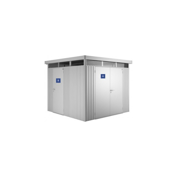 Montando una porta aggiuntiva sulla parete laterale potete accedere alla casetta da due lati. La porta supplementare viene fornita con una maniglia in acciaio inossidabile. Set con cilindro standard, una serratura tripla, una molla a gas, cerniete, sono inclusi due portautensili e le relative piastre laterali di arresto della porta. La battuta della porta può essere solo a destra.
