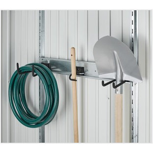 Set, che consiste di un gancio per scopa, un gancio per pala, un gancio multiuso, e una guida da parete, inserita tra due montanti.