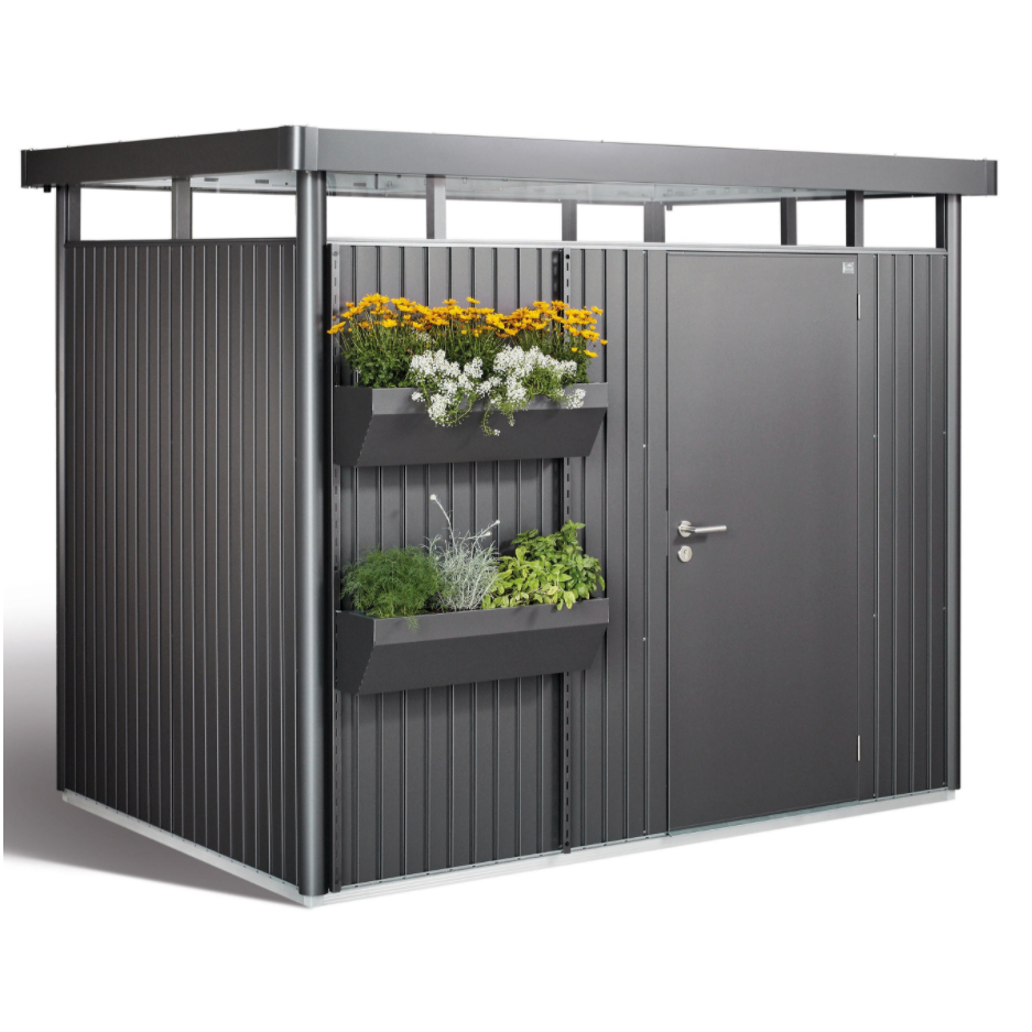 Accessorio per casetta HighLine: FloraBoard! Due montanti avvitate alla parete esterne nel colore della casetta rende possibile appendere le fioriere a qualsiasi altezza. Inserti in plastica per una maggiore facilità di impianto sono forniti come standard.