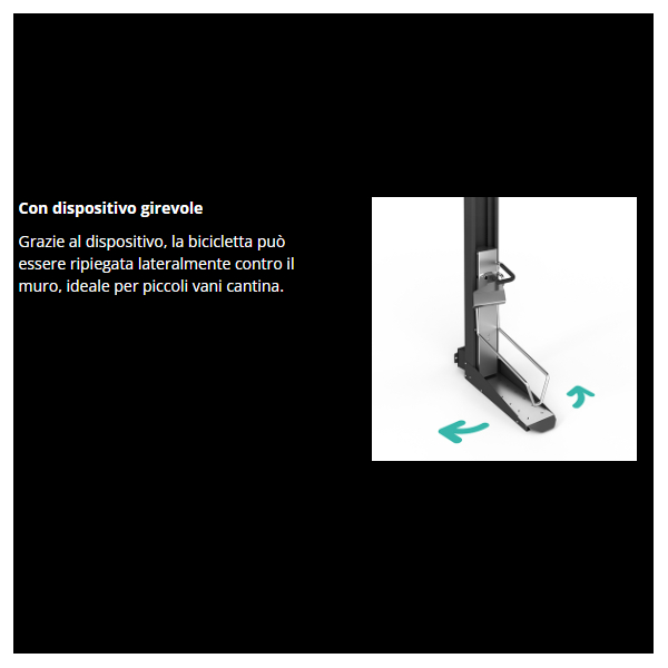 Con dispositivo girevole - Grazie al dispositivo, la bicicletta può essere ripiegata lateralmente contro il muro, ideale per piccoli vani cantina.