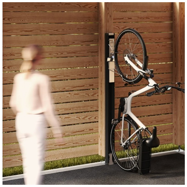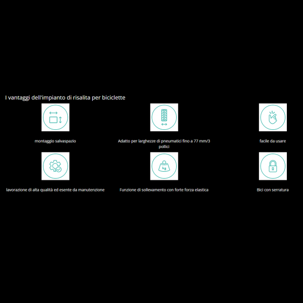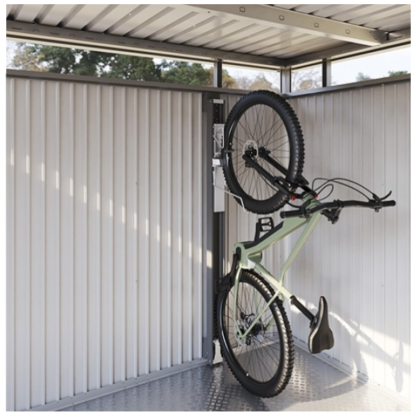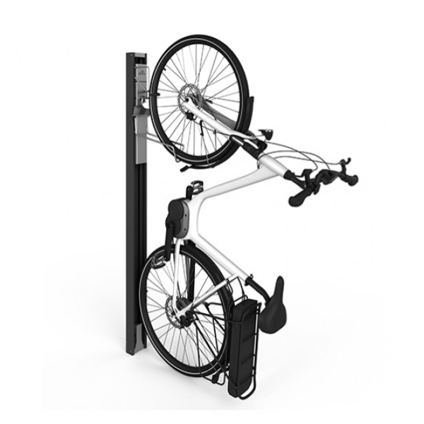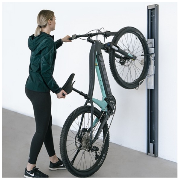 Fissata in modo sicuro e, se necessario, anche bloccabile, la bicicletta si appende verticalmente alla parete per risparmiare spazio.