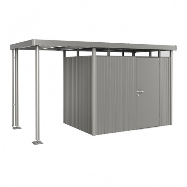 Il tetto laterale S è un fantastico accessorio da aggiungere alla casetta HighLine(A partire dalla mis. H2). E' fissato alla casetta di volta sul lato con la grondaia antipioggia. A scelta su uno o entrambi i lati. Questo crea uno spazio aperto coperto nella misura della superficie semplice/doppia della casetta portaattrezzi. I supporti in alluminio sono dotati di piedini regolabili in altezza. Il tubo pluviale è incluso!