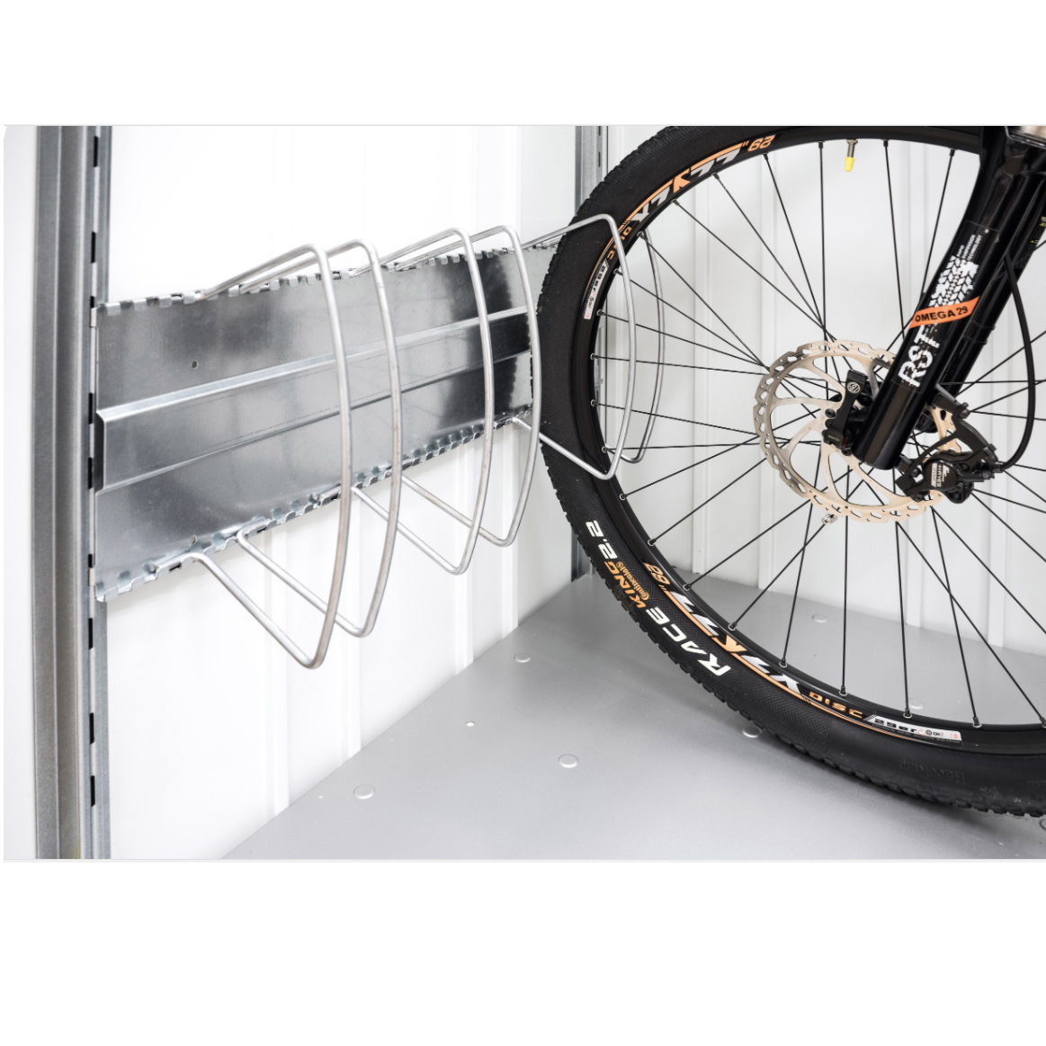 Fantastico accessorio per Baule StoreMax 190, facile da inserire in un secondo momento. Il set è composto da una piastra di base, 2 montanti e 3 supporti per biciclette e materiale di fissaggio. La lastra di base, incluse le leve di bloccaggio regolabili, è agganciata su due montanti.