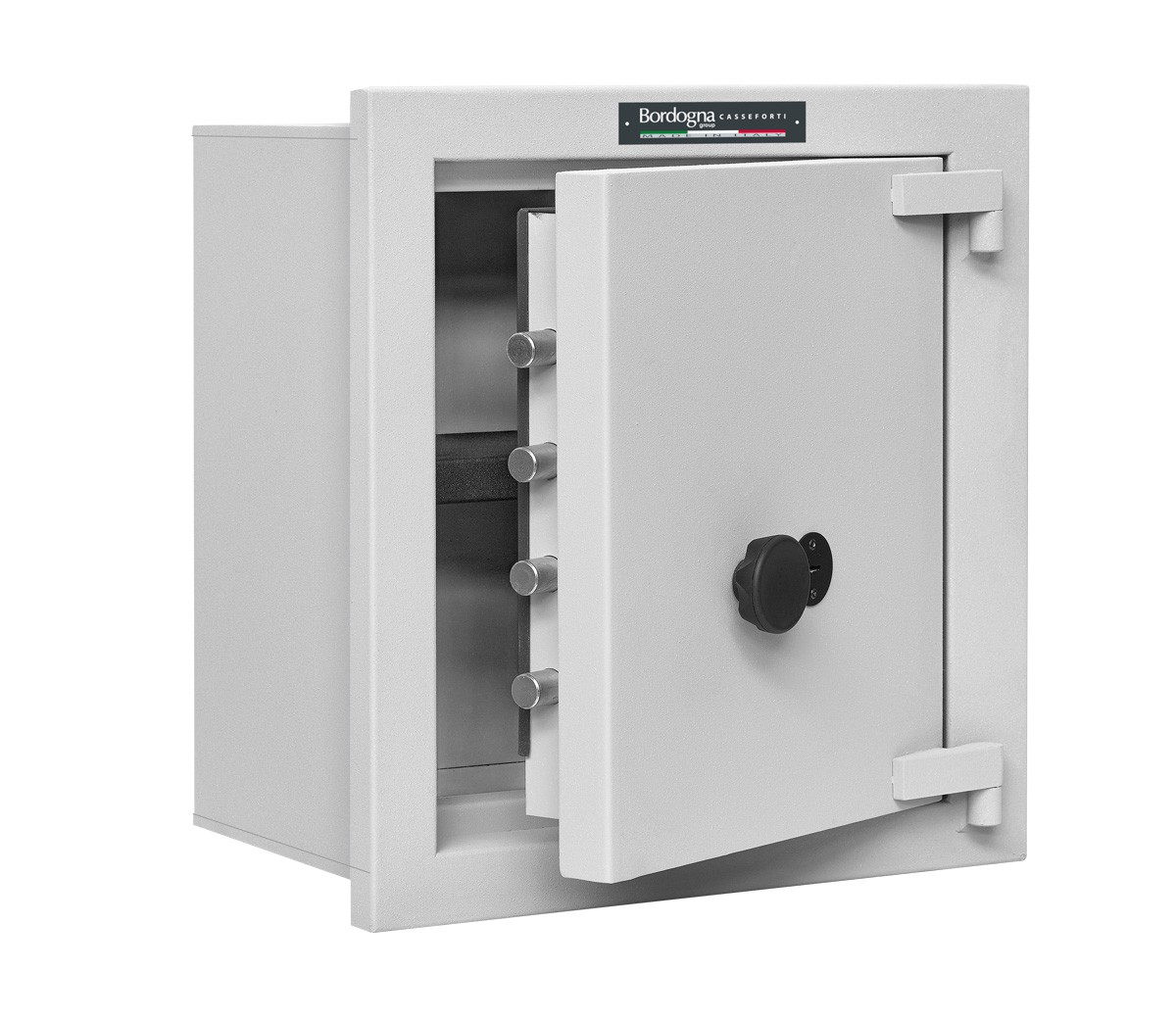 Cassaforte da muro certificata in III livello secondo la normativa Europea EN 1143-1. La soluzione per proteggere un oggetto prezioso, delle piccole armi, contratti, documenti! Tutto in totale tranquillità!Prodotto della Bordogna, la tua sicurezza di fiducia. Presenta anche delle barre fisse all’ interno del battente a funzione antistrappo.