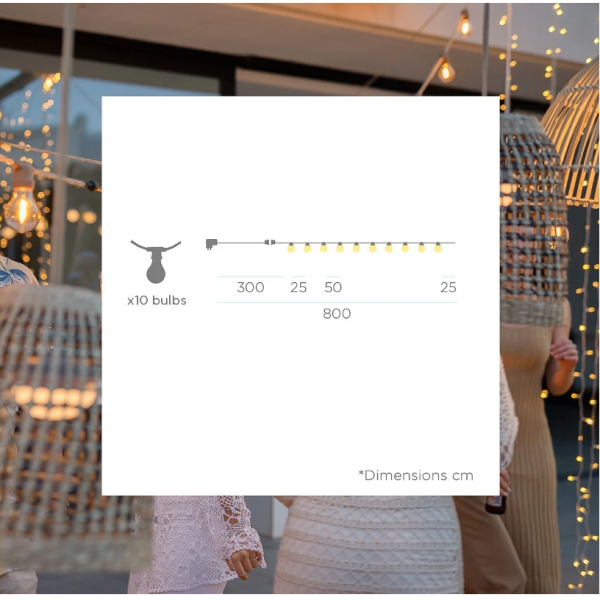 Fantastica fila di luci led molto scenica e di impatto, questa catena luminosa è lunga 8 metri adatto per esterno con grado di protezione IP 44. Ideale da appendere in giardino o sotto il gazebo: con le sue fantastiche 10 luci led riuscirà a far risaltare la zona rendendola perfetta per ogni situazione. Con una sola fila di luci riuscirai ad ottenere l'atmosfera giusta che stai cercando!