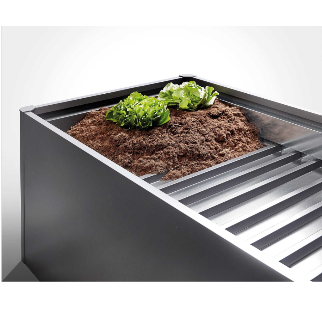 Il pavimento intermedio riduce il volume del terreno facendo risparmiare il materiale di riempimento dell’aiuola facendo abbassare costi e tempo. Il ripiano intermedio viene inserito durante il montaggio all’altezza desiderata.