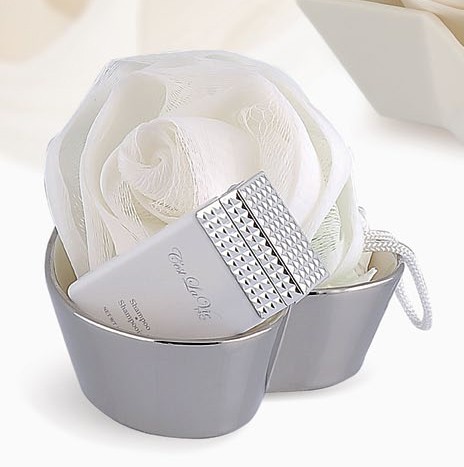 Ciotola di ceramica della linea Hervit colore argento. Dentro si trova pure una splendida spugna a forma di rosa e una idratante crema corpo. Hervit pensa a tutto per voi.
