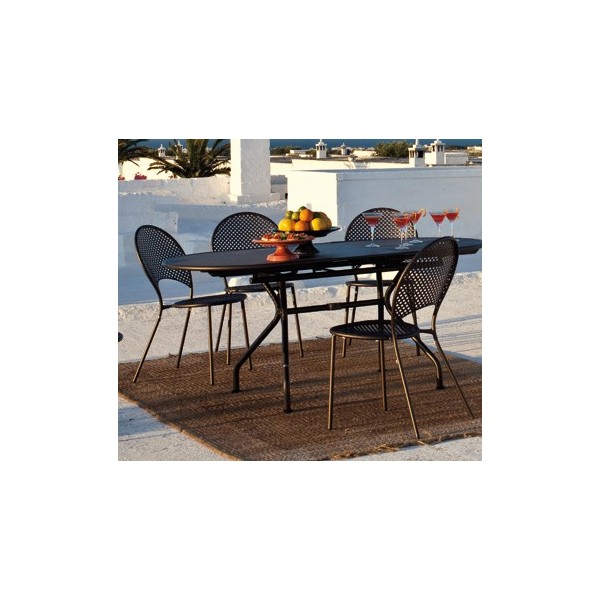 Il traforo a maglie larghe della lamiera disegna su sedili e schienali il motivo caratterizzante la serie. Cuscini imbottiti invitano al relax intorno a un tavolo, nella terrazza di casa o nello spazio all’aperto di bar su vie e piazze fascinose.