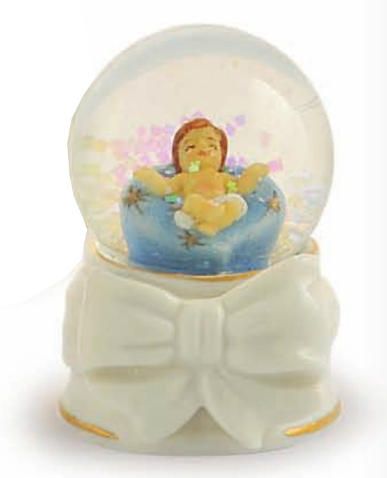Palla di Natale contenente il bambino Gesù, sulla base presenta un fiocco dii ceramica per abbellire il tutto. Direttamente da Hervit.