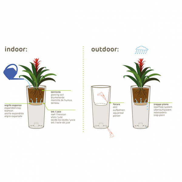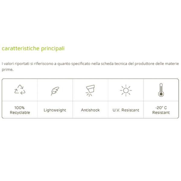 Questo vaso sono realizzati con polipropilene atossiche e riciclabili, le cui caratteristiche garantisco la resistenza alle intemperie (-65° + 85°) agli urti e ai raggi U.V.